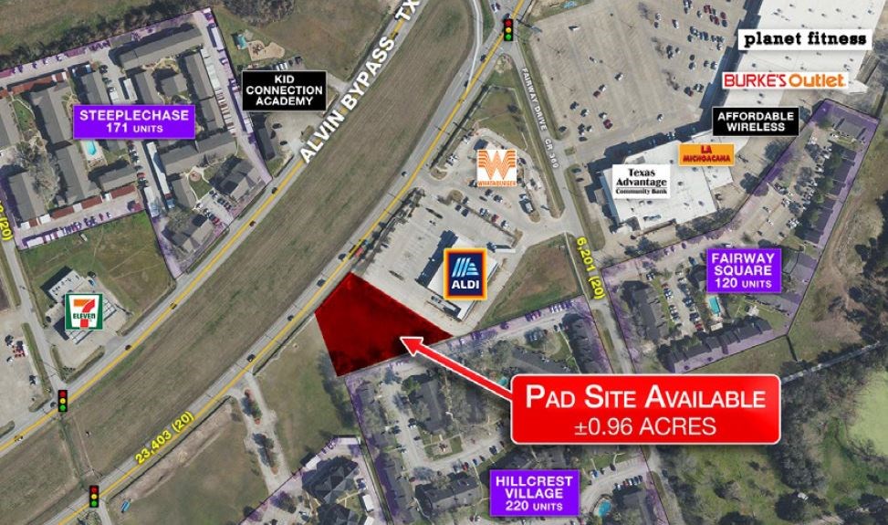 0.96+/-ac outparcel. Located just off the SH-35 bypass and seeing approx. 23,000 vpd sets this property up nicely in the quickly growing town of Alvin just 30 miles South of Houston.